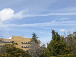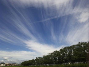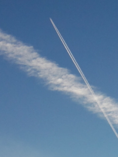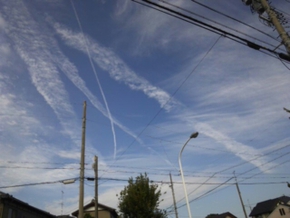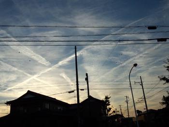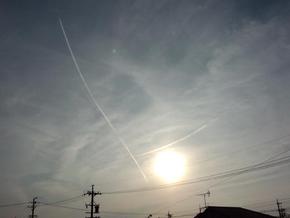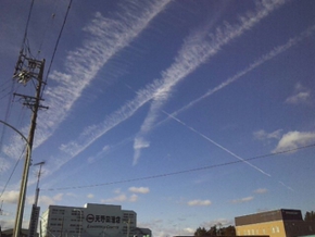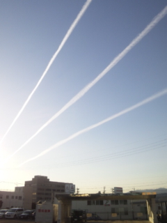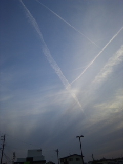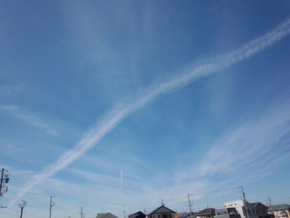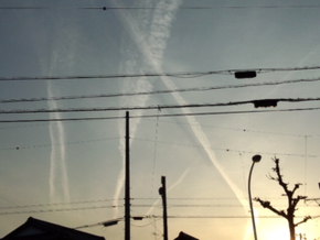 最近は奇妙な短いまま消えずに空にいつまでも残っている怪しくも不思議な飛行機雲が多かった私たちの住む町の上空。