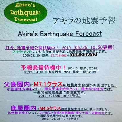 色々な博士等もご自身のサイトなどで紹介をされていることもある「アキラの地震予報」が昨日の午前中に「父島圏内にM7.1クラ… 詳細はこちら “またまた驚かされた現実!ずっと参考にさせて頂いて来ている「アキラの地震予報」がまたまた昨日の千葉の地震を!!”