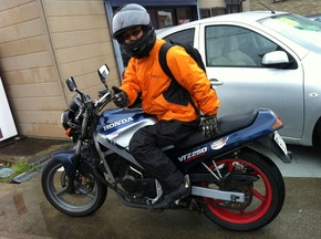 今日の雨の中、車の修理を依頼してくれている弟さんと一緒にVTRに乗った「もみくん」が合羽を着たまま私の前に現れました。