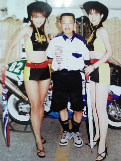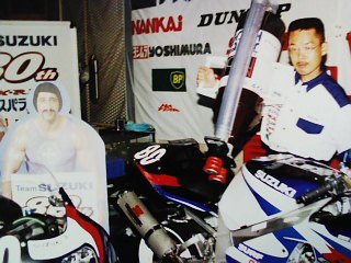この写真は2000年の「スズキ80周年記念チーム」の時のピット内で撮影したんですが大笑いでしょ!