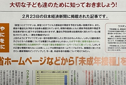 何度も話題に触れて済みませんがいよいよ地元でも始まる5歳~11歳の子供への「まだまだ治験中であるmRNA新型コロナワクチ… 詳細はこちら “子供達の事が心配な方々に差し上げます!先日の「日本経済新聞」のに掲載された記事を印刷し直したチラシです!本日配布します!”