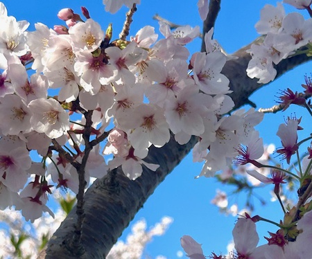 桜見物を楽しめる季節なのに何故か前日まで全くと言って良いほど見られなかった綺麗な青空が顔を出し頑張って咲き残ってくれていた花達がとても綺麗で皆さんを祝福している様にも見えました。
