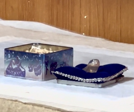 今回嬉しかったのが小さな青い缶の棺にはハムスターのふくの周りにしっかりとオガクズが敷かれ好きなイチゴが刻まれて供えられていた事と理由はあえて聞いておりませんが小さなガラスの靴が飾られていたこと。