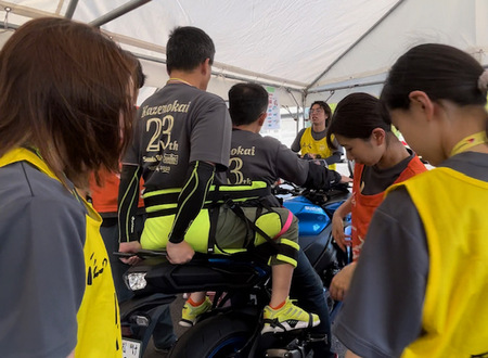 身体にハンディを負ってしまう事になってしまった方々をシートベルトメーカーの協力を得て、現役や過去に頑張った国際A級ライダーの後ろに固定をしてサーキットを走ると言う素晴らしいボランティアのイベント!