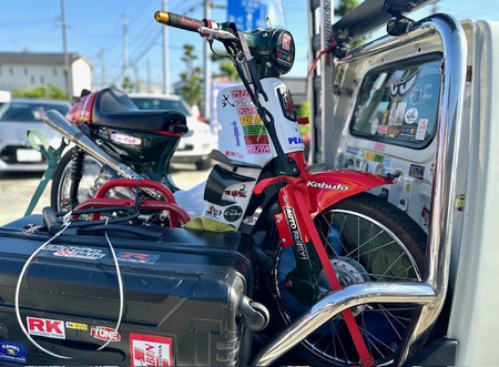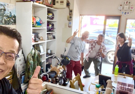 その井上さんが先日 福田港で行われたダイハツのエンジン(EF・JB型)を搭載した車のオフ会に参加をされ、その後にミゼットⅡ友の会のオフ会にも参加をして頂いたレーシングカブでお馴染みのチーム「アクノソシキ」のライダーUくんと、「まだまだ高速は怖くて!」と遠路神奈川県まで下道で帰らなければならないというKちゃんと共にご来店をして頂きました!