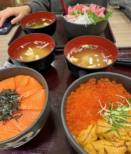 3人でウニイクラ丼などと言えば9000円となりますのでサーモン丼とマグロ丼を孫達が、そして私がウニイクラ丼を頼み3人でシェアをする事に致しました。