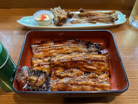 後は二人が一品づつと言うことでカニまみれのカニクリームコロッケと柔らかく仕上げた地元浜名湖産の鰻の蒲焼で終了。