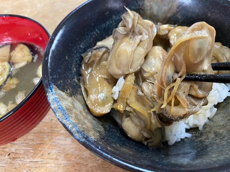 私が食べ方を悩んでいると従業員さんが早速「しぐいれ煮」にしてくれご覧の通りのショウガの効いた立派なカキのしぐれ丼が完成!