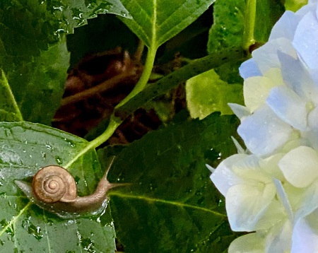 初めはカタツムリだけの紹介にしようと思いましたが、紫陽花の花が私が大好きな色にまだ変化していなかったので「予告」として少しだけ載せる事に致しました。