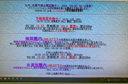 昨日の「アキラの地震予報」ですが午前中の9時47分にアキラさんが柿岡地磁気観測所のある茨城県を中心とした「柿岡圏内」にマグニチュード6.4クラスの地震予報を出してくれたのですがその約6時間後の15時55分に最大震度4、マグニチュード5.4の地震が発生致しました。