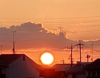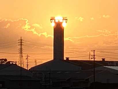順番が前後致しますが2枚目の画像は何と私達の町のシンボル的な存在のエレベーター会社の塔と夕日が重なった時の画像。