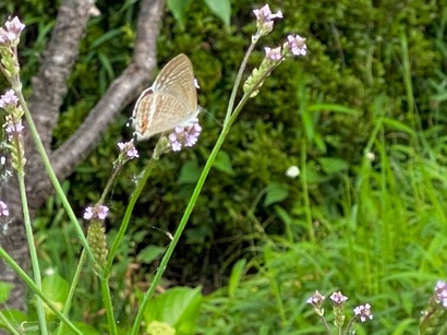 昨日の散歩中にそんな紫陽花を見ていると地味な茶色の蝶がとまったのですが羽を開くと何ととても綺麗な紫色をしているではありませんか!