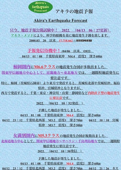 驚きなのが「アキラの地震予報」のアキラさんが「3.11」より前にその長年研究をして来た技術を政府に無料で譲渡しているにも関わらずその技術を生かそうとしていない事。