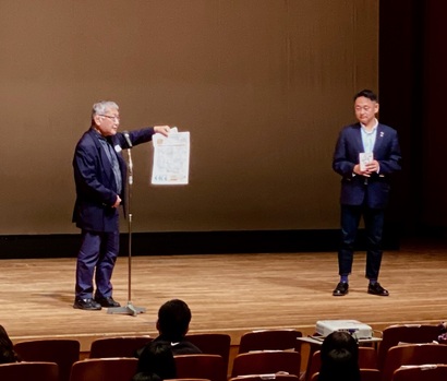 こちらは今回主催を頑張って頂いた加藤さんが舞台で私が子供達の為に配らせて頂いている「日本経済新聞」に掲載された記事と同じ内容の文面のチラシの紹介をして頂いているところ。