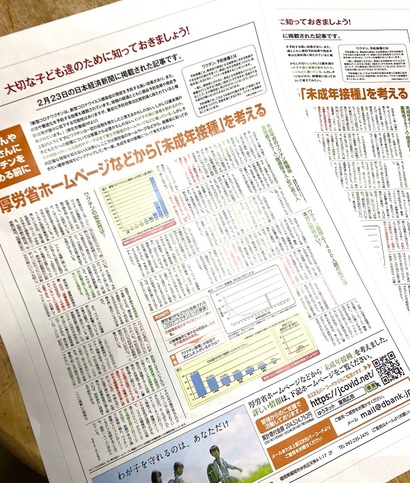 先日のブログでもご紹介をさせて頂いた子供達へのワクチン接種を悩まれている方々や不安を持った方々にとても参考になった「日本経済新聞」の1ページを使って載った厚生労働省のデータを元に解り易く「リスクと必要性の無さ」を教えてくれた記事。