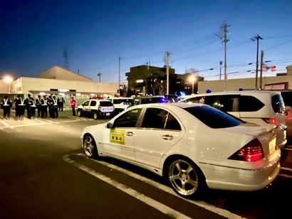 袋井警察署長や袋井市長や来賓の皆様との室内での式の後はいよいよパトカーや青パトが一斉に街にパトロールに出発を致しました!