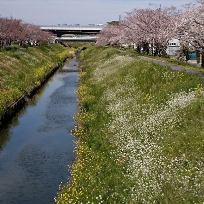 そして二枚目の菜の花が写っているのが堤防を北に歩いて行くと現れるバイパスまでの一番北側の菜の花と白い花とのコラボが綺麗な桜並木の写真