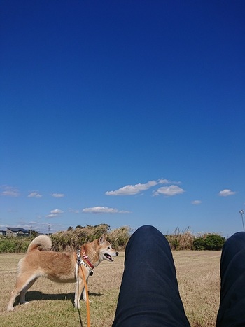 写真は愛犬ヨコネとの散歩で訪れた大きな芝生の広場に寝転んで撮ったもの!