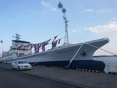 そんな本日!私が今まで見たことの無い沢山の大漁旗が掲げられている「大きな漁船」を発見!!