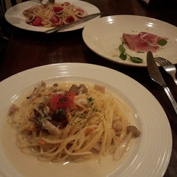 今回は金田さんが初めてという事でご本人が好きなメニューを一品と私が超お気に入りのキノコタップリのウニクリームパスタを頼み少しだけお分けいたしました!