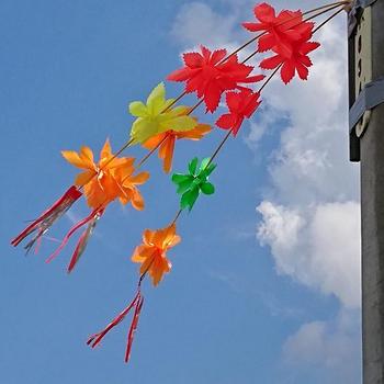 当社展示場のある天神町の電信柱にも地元の祭り青年の皆さんが苦労をして取り付けてくれたカラフルなもみじの飾りが秋風になびいています。