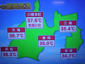 お客様の中にも車内の外気温度計を見て驚かれている方々も時々おられますが本日の気象庁の発表の県内の最高値は川根本町の37.6℃だとニュースでいっておりました。