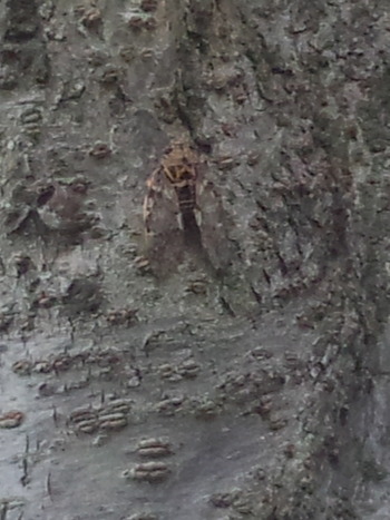 下の写真はやっと見付けて写真が撮れた鳴いている最中のニイニイゼミのすがた。