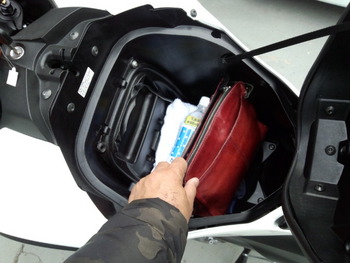 スポーツバイクなら財布や色々な小物をいかに少なくして出発しようかと思うところですがNCは普通のバイクの燃料タンクの部分に大きなトランクスペースがあり色々な物が入ったバックとタオルと乳酸菌を摂る為の飲み物も楽々入るのです!
