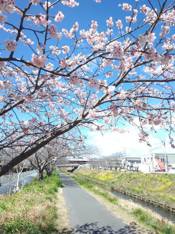 菜の花はもう満開で堤防は黄色に染まっておりこの桜の木の下に立つと若干寒くても完全に春を感じます♪