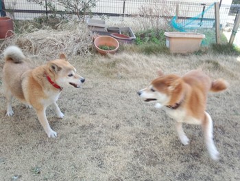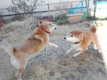 時々私と早朝に一緒にはしゃぐ愛犬のヨコネですが本日は「さんた」も機嫌が良かったようで二人(世間では二匹!)は庭で大はしゃぎ!