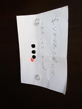興味深々で近付き見せて頂くと「やくそくをやぶったらつぎのいえに行きます。」と書かれ何と署名がされ母印まで押されているではありませんか!
