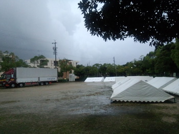 子供達が踊ったり、カラオケ大会などが行われるステージとなるウィング式の大型トラックや祭り青年の皆さんが木曜日から仕事を休んでまで飛び回り公民館からかなりの数のテーブルや椅子を運んだり何と8張りもテントを苦労して張ったりしてくれてあるのですがあまりにも風雨が強いと出来なくなってしまいます。