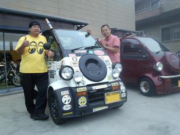 「今、大阪なんですよ!」と言った私に「あいるとん流」さんが「外を見て下さい!」と言ったので窓を開けてみると派手なステッカーが貼られたミゼットⅡがいるではありませんか!