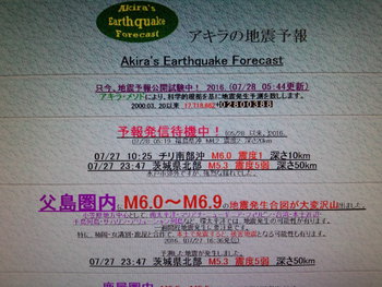 しかし、私がずっと参考にさせて頂いて来た「アキラの地震予報」では何度も色々な地震が起こる前に警告をしてくれており「もっと国が素直に今までの研究の無意味さを認めこのような方々にもっともっとサポートをしてくれたら・・・・」と何度も思ってきました。