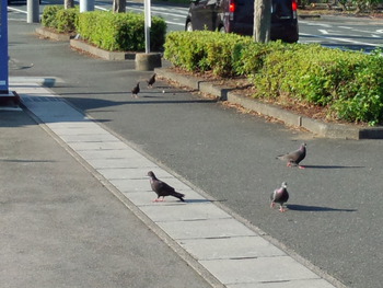 そして散歩から戻って来ると展示場の前にはいつもいることのない鳩の群れが!