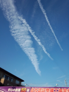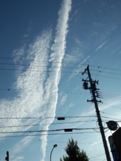 私たちの上空のみに現れたもの凄い飛行機雲らしきもの。