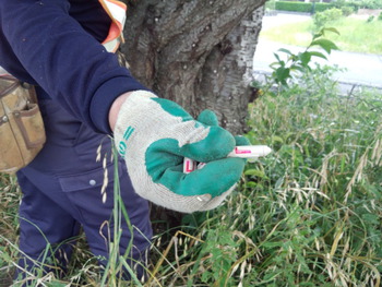 私が「いつも気になっていたんですがそれは樹液か何かを止める為にやっているんですか?」訪ねると「いや実はこれは毛虫が増えるのを防ぐためにやっていて、これ(写真の手に持っているもの)にはその薬が入っていて幹の中を水分と一緒に通って行く事によって葉まで行き毛虫が食べれない様になんです」と現物を見て丁寧に教えてくれました。