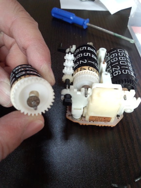 よく見て頂けると解って頂けますがトリップメーター本体を動かしているギヤの中央部分が割れてしまっており、オドメーター(積算計)のギヤから駆動がされなくなっていたのです。