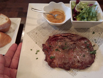 丁寧な手造りの前菜の後で150グラムの100%牛肉を使った私には十分なボリュームのステーキが登場!