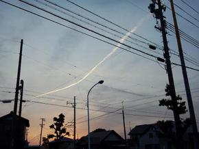 最近は雨の日が多く何だか不思議な感じがしておりましたが久々に晴れ始めたと思っていた本日の夕方・・・・・またまた怪しい飛行機雲が急に現れ始め青空を奪いました。