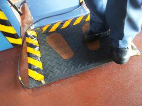 ライトと同時に行われる排気ガスのテストもマフラーに測定の為のプローブを入れ再度位置を変えこの足のマークのマットの上に立たないと始まらない事も新たなシステムの特徴・・・・・・