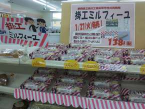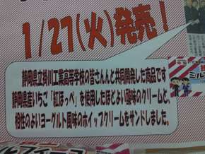 そして「はっ!」として改めて見直したところ何と!派手な大量の袋と共にコマーシャルがされている「掛工ミルフィーユ」と書かれたボードに「掛川工業高等学校」の文字も入っているではありませんか!