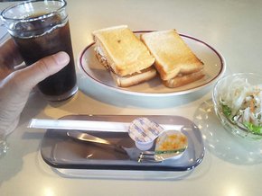 今回のメニューはチキンカツが半分でチーズとハムが挟まれたものが半分のトーストにサラダにアイスコーヒー!
