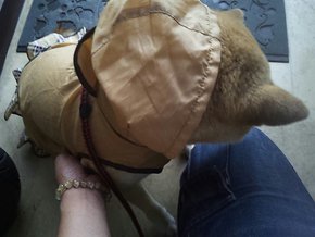 今朝も残念ながら散歩の時間に雨が降っていたので久し振りにヨコネにカッパを着せると・・・・何とウエスト部分がパンパンではありませんか!