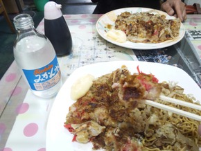 私は長い間通っていたのに先日初めてテレビで知った「おこそば」を注文!Mさんはいきなり初挑戦でお好み焼きの大(約並の倍弱!?)を注文!