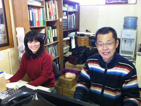向かって右が猪股自動車整備株式会社代表の猪股延晃さん。左はスタッフの長谷川さん。「ウチの社長は見た目は怖いんですけど(笑)、虫を捕まえても指でそっとつまんで外に逃がしてあげる、実はそんな人なんですよ(長谷川さん)」