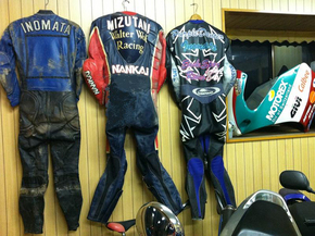 本文中にもあるとおり、猪股社長は元バイクレーサー。それも(本人は謙遜するが)かなり速い、天才肌のライダーだった。写真のつなぎは両端が猪股社長のもので、真ん中は伝説的バイクレーサー水谷勝選手のもの