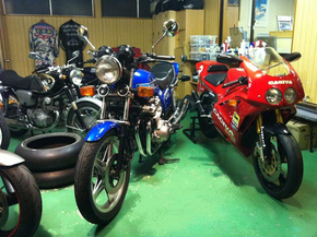 猪股自動車整備株式会社にはレアなバイクも多数陳列されている。左の青いマシンは社長の愛機である懐かしのホンダCB750Fで、右側の赤いマシンは「世界に1台」だという125ccのイタリア製のスペシャルマシン!