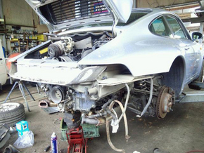 本社工場にて作業中の空冷ポルシェ911。こういった重整備もお手の物だ