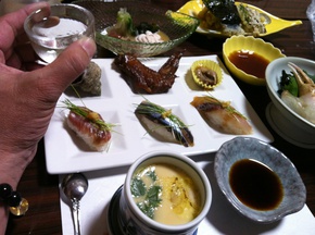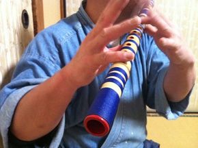 おっと!気が付けば美味しい日本酒と笛を持って今回の料理を造ってくれた「とりや茶屋」のヨッチャンが忙しい合間をぬって登場!(写真はヨッチャンのもう一つの姿!)